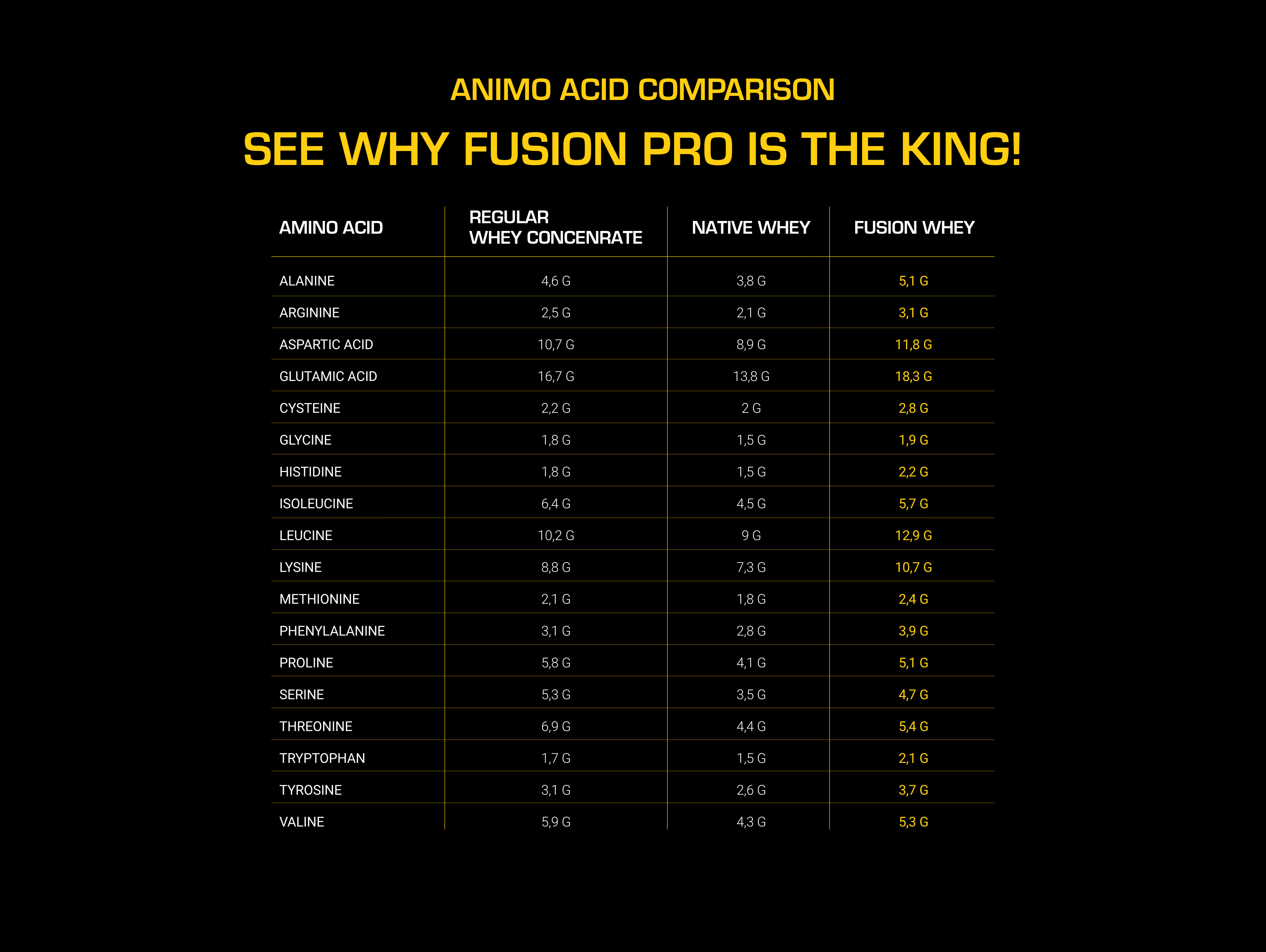 The end result is something truly unique, Fusion Whey™ has an amino acid profile that is unlike any other whey. Even beating out the so called best whey, Native Whey, by a land slide.