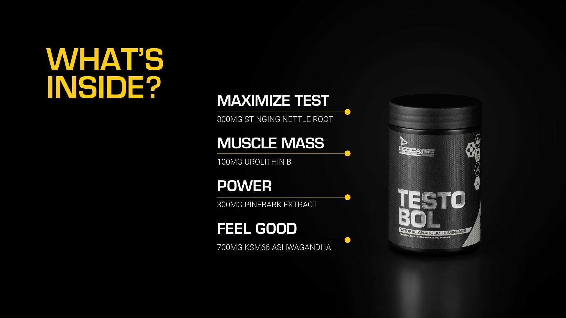 TESTO-BOL™ contains our one-of-a-kind Stinging Nettle Root extract with patented KSM66™ ashwagandha and several other unique ingredients.